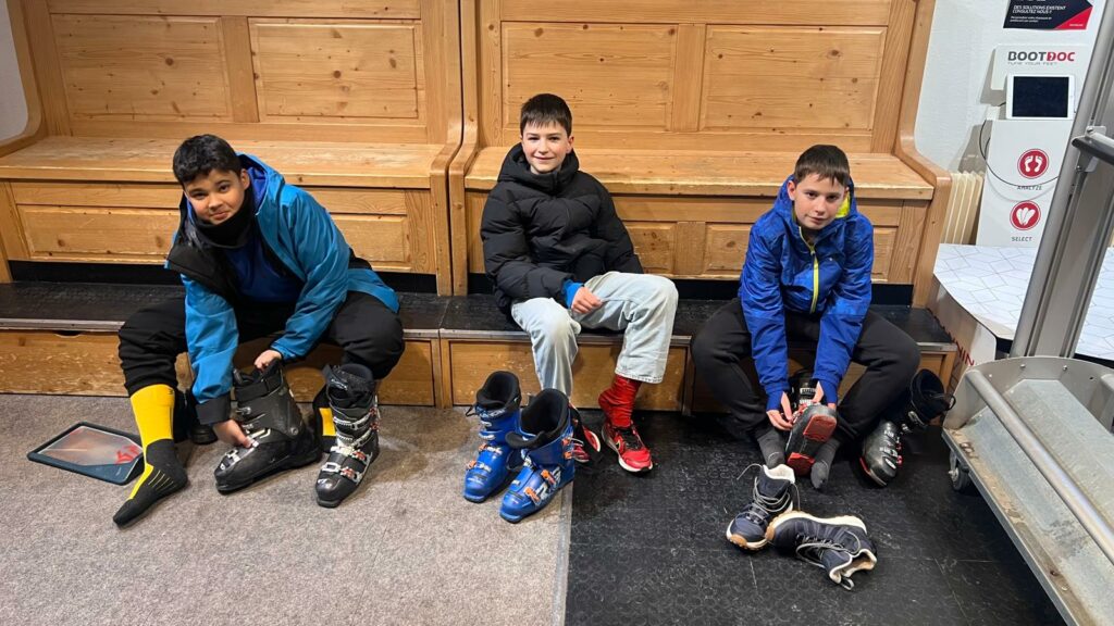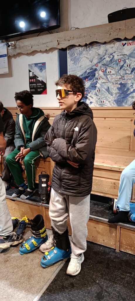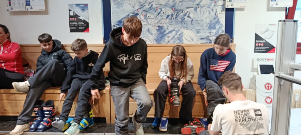 Nous nous installons dans nos chambres au Nid Alpin. A peine le temps de souffler que nous allons essayer notre matériel de ski avant les consignes du séjour et un bon repas.